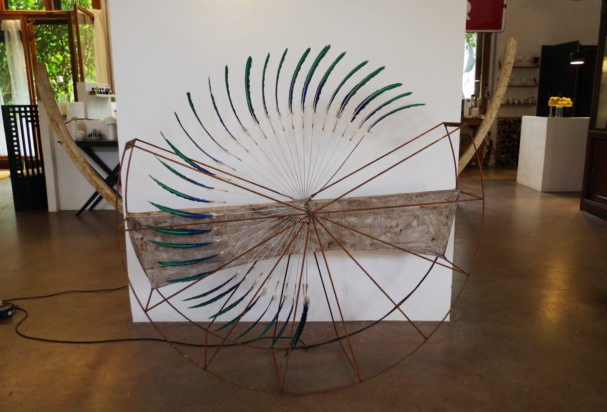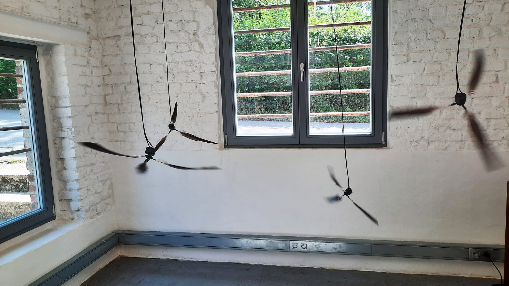 „MEETING“ - Kinetik trifft Malerei, in der ART-Loft Eupen, dialogische Ausstellung mit Christoph Steeger und Boogie Hebel 13.7.- 17.8.2025 - Bei der Präsentation der kinetischen Objekte in der Art-Loft von Boogie Hebel stehen sich Werke gegenüber, die zwar von unterschiedlicher Machart sind, aber einige Ähnlichkeiten aufweisen. Die gestische Dynamik in der Malerei Hebels fordert uns dazu heraus, uns seine impulsiven Bewegungen mit Pinseln und Farbe während des Malens vorzustellen: ein emotionaler Vorgang bildet sich ab in Bewegungsspuren. Und wer sich dem Spurenlesen hingibt, kann sich davon zu eigenen Gefühlen anregen lassen, denn im Durchleben einer Bewegung (Motion) offenbart sich die Empfindung (Emotion). Demgegenüber stehen die kinetischen Objekte von Christoph Steeger, die mit ihren Bewegungen in den Raum zeichnen. Stellt man sich ihre Aktionen als verwehende Spuren vor, wird die formelle Verbindung zur Malerei von Boogie Hebel spürbar und regt an zu einem Vergleich. Dies wird auch im Atelierbereich von Boogie Hebel deutlich durch die räumliche Zweiteilung, wobei in der einen Hälfte die aktuellen Gemälde von Hebel und in der anderen Hälfte die Roboter-Installation „living in turmoil“ von Steeger gezeigt werden, der stacheldrahtbewährte Figuren ein chaotisches Bewegungsspiel aufführen. Neben der Gegenüberstellung im Atelier werden einige bewegte Objekte im Mittelgang des Wohnbereichs vom ART-Loft gezeigt. Hier stehen sie den großflächigen Gemälden Boogie Hebels gegenüber, welche dort dauerhaft präsentiert werden. Auf dieses Spannungsfeld wird jeder Besucher des ART-Lofts aufmerksam gemacht, weil er die Aktionen der Objekte auslöst (über Sensoren). Und weil die Malerei und die Objekte sich ansichtig gegenüberstehen und der Betrachter diesen Bereich stetig begeht, befindet er sich inmitten der dialogischen Bezüge zwischen den Werken. Die Bezüge reichen jedoch weit über das ART-Loft hinaus, denn sie stehen im Verbund mit zwei anderen Ausstellungsorten: der Galerie „VORNUNDOBEN“ (Benjamin Fleig, Eupen) und dem „Zollhaus“ (Grenze Aachen/Raeren, KuKuK e.V.). – Diese Ausstellungen mit Installationen und kinetische Objekte werden unter dem Konzept „PARCOURS“ werden dort zeitgleich gezeigt. Christoph Steeger studierte Bildhauerei an der FH-Köln und wurde 1989 Meisterschüler von Prof. Anton Berger. Zeitgleich schuf er Bühnenbilder für den modernen Tanz und arbeitete bis 2024 als Film- und Fernsehausstatter. www.christophsteeger.de Vernissagen: 6. Juli 2025, 15:00 Uhr (VORNUNDOBEN), 13.Juli 2025, 15:00 Uhr (ART-Loft), 20.Juli 2025; 15:00 Uhr (Zollhaus)